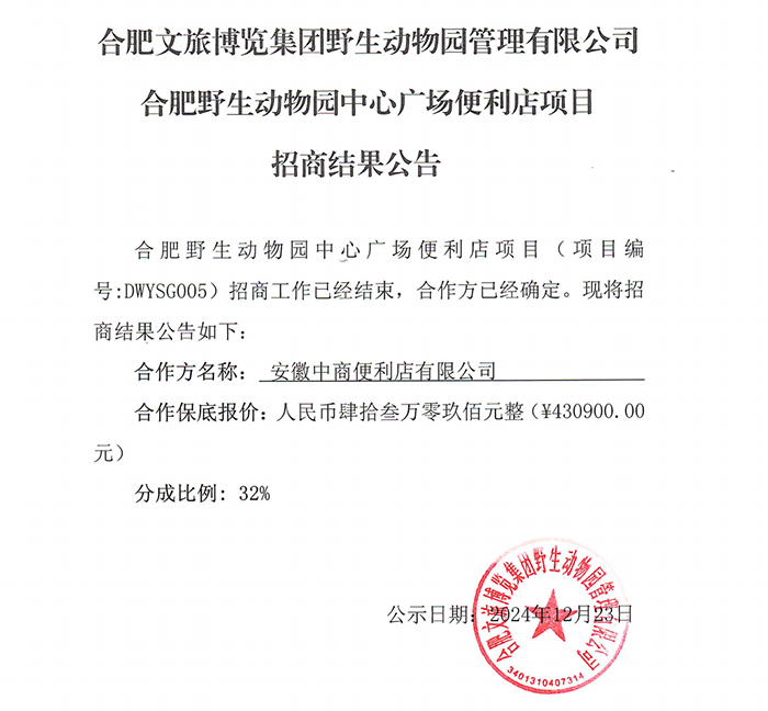 合肥文旅博览集团野生动物园管理有限公司合肥野生动物园中心广场便利店项目招商结果公告