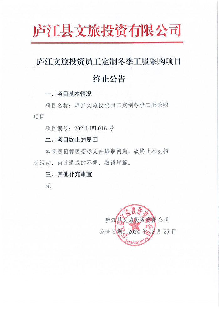 庐江文旅投资员工定制冬季工服采购项目 终止公告