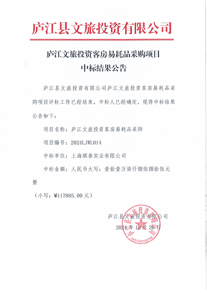 庐江文旅投资客房易耗品采购项目中标结果公告