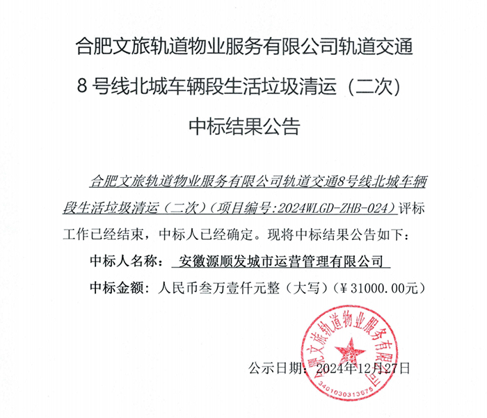 合肥文旅轨道物业服务有限公司轨道交通8号线北城车辆段生活垃圾清运(二次) 中标结果公告