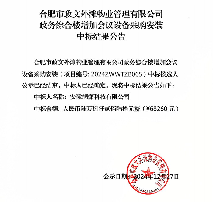 合肥市政文外滩物业管理有限公司政务综合楼增加会议设备采购安装中标结果公告