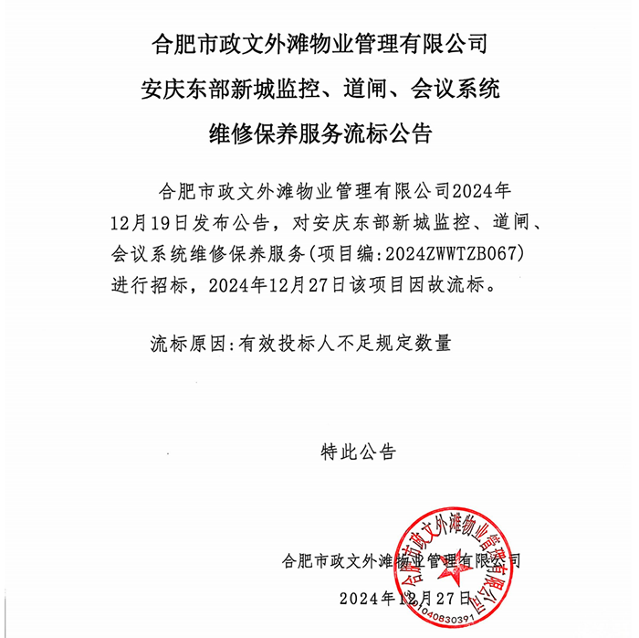 合肥市政文外滩物业管理有限公司安庆东部新城监控、道闸、会议系统维修保养服务流标公告