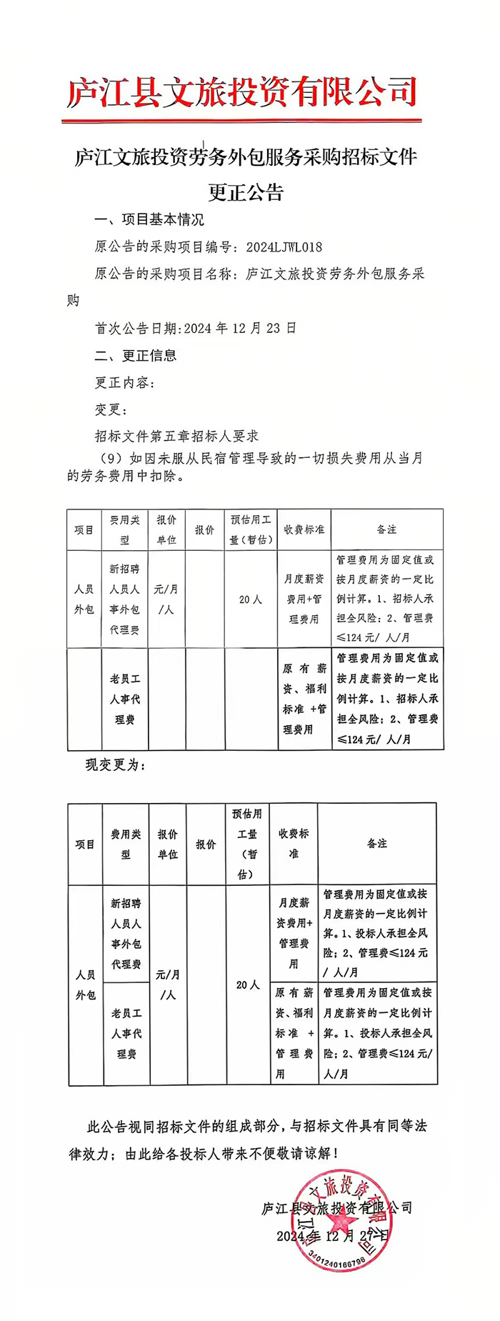 庐江文旅投资劳务外包服务采购招标文件更正公告