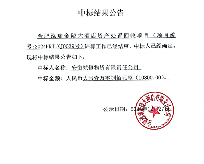 合肥泓瑞金陵大酒店资产处置回收项目