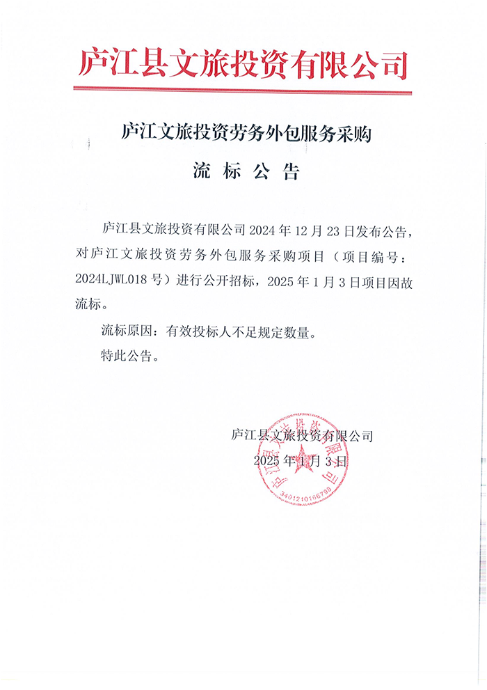 庐江文旅投资劳务外包服务采购流标公告