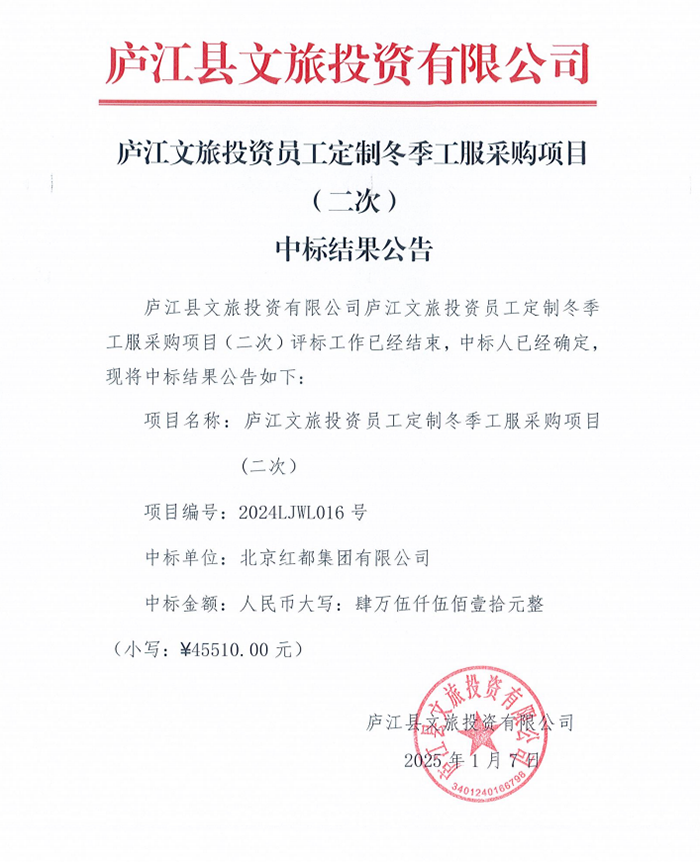 庐江文旅投资员工定制冬季工服采购项目(二次) 中标结果公告