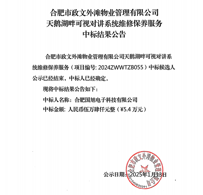 合肥市政文外滩物业管理有限公司天鹅湖畔可视对讲系统维修保养服务中标结果公告