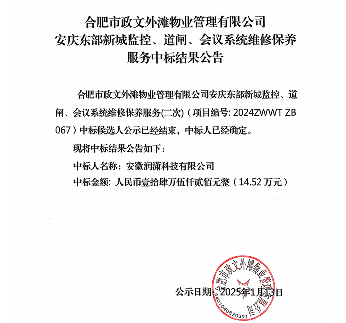 合肥市政文外滩物业管理有限公司安庆东部新城监控、道闸、会议系统维修保养服务中标结果公告