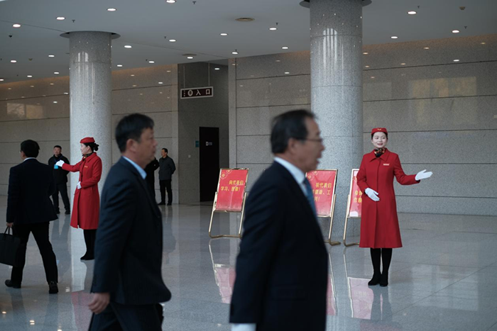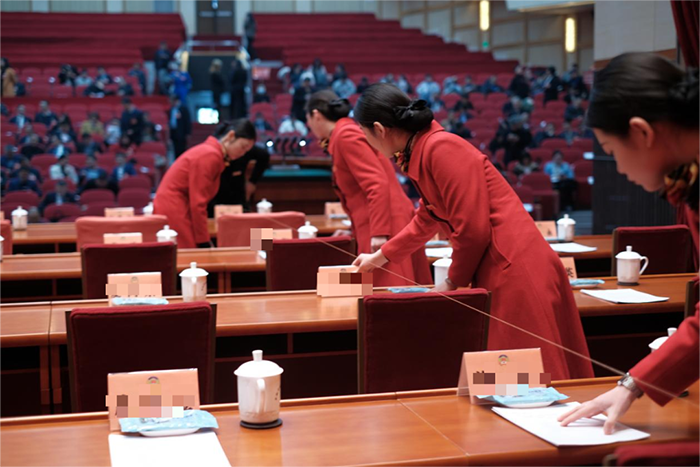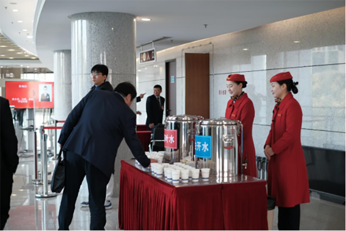 会议桌上,水杯里的茶水热气袅袅,在寒冬里温暖着每一位代表委员的心。茶水的有序提供,背后是客服人员一整套高标准化的培训。茶水如何倒、何时倒、倒多少都大有讲究,包括礼仪规范、应急处理的培训等等,均需要确保在服务过程中能够展现出专业、精细良好的服务形象。