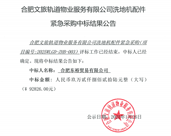 合肥文旅轨道物业服务有限公司洗地机配件紧急采购中标结果公告