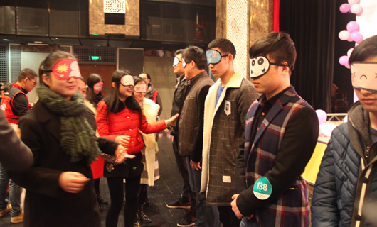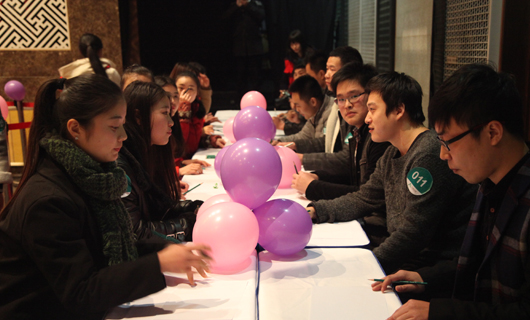 下午14:00,活动正式开始,全体互动游戏击鼓传花把场内气氛推向一个小高潮。一共3轮的击鼓传花不仅带动了现场气氛,也让数位嘉宾上台进行了自我介绍,表演了才艺,引来阵阵掌声和欢笑。经过数轮热身活动后,开始主题活动“五觉体验”。10对男女嘉宾上台,经过“嗅觉”选取心仪对象,通过“触觉”一起走过障碍物,再由“味觉”互喂糖果,“视觉”画出彼此心目中的男神女神,最后由“听觉”去深入了解。让一对对俊男靓女从陌生走向熟悉,活动中穿插的互动游戏“踩气球”与“五觉体验”一起把活动推向了最高潮。在“视觉”过程中,主持人挑选12对嘉宾上台进行对战,两人一组并在腿上绑上气球,场面热烈,笑声掌声不断。16:30,活动在抱抱团的全场互动及幸运大抽奖的现场表白中圆满结束。