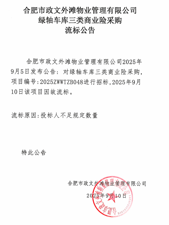 合肥市政文外滩物业管理有限公司绿轴车库三类商业险采购流标公告
