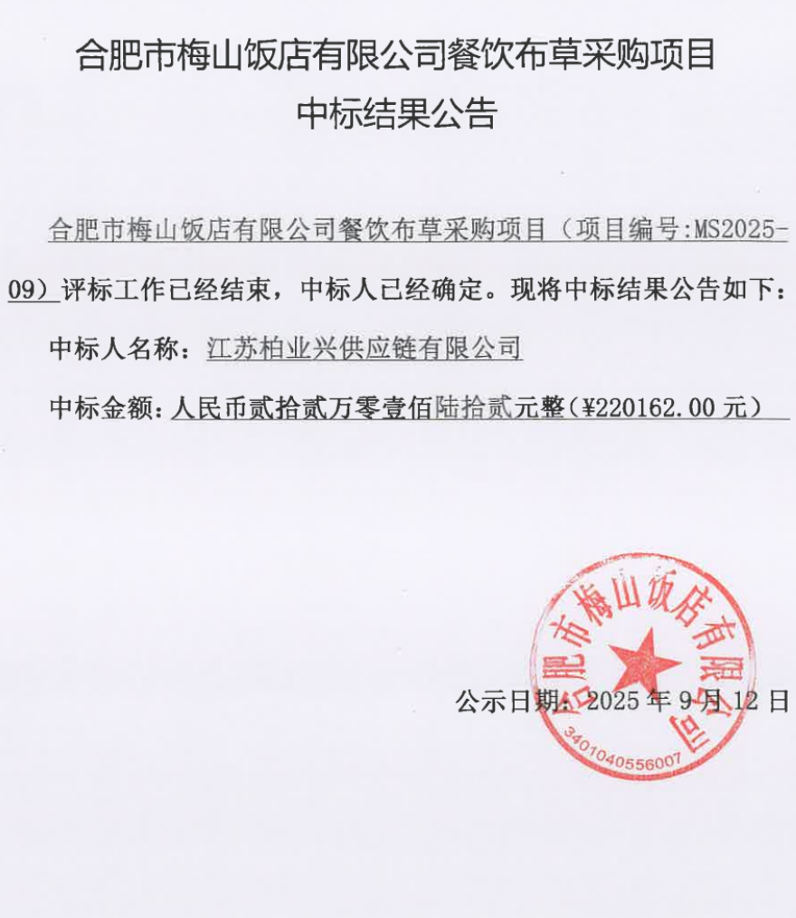 合肥市梅山饭店有限公司餐饮布草采购项目中标结果公告