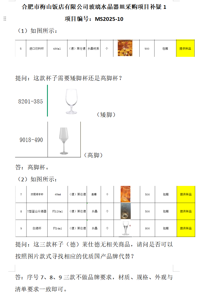 合肥市梅山饭店有限公司玻璃水晶器皿采购项目补疑1